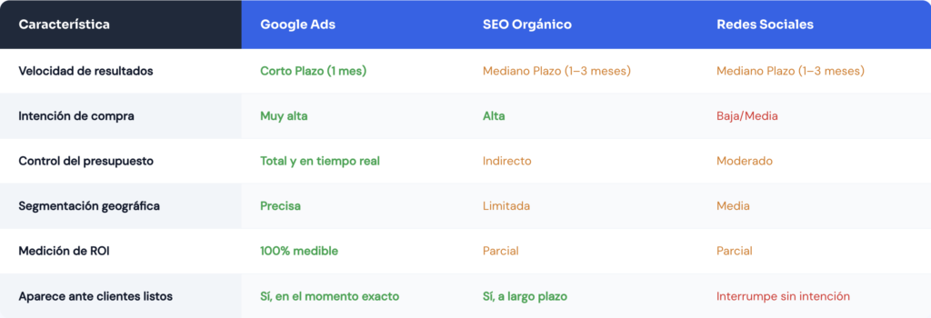 Google Ads ofrece resultados inmediatos mediante anuncios pagados que aparecen en la parte superior de los resultados. El SEO posiciona tu sitio de forma orgánica sin costo por clic, pero puede tardar meses. La estrategia más efectiva combina ambas: Google Ads para resultados a corto plazo y SEO para crecimiento sostenible a largo plazo.